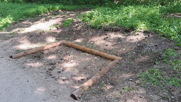 La première étape a consisté à creuser deux rectangles d’environ 4 m² à l’aide d’une mini-pelle mécanique. Les astreints ont ensuite façonné des rondins de bois pour former les structures de délimitation, solidement ancrées dans le sol. Une fois le cadre en place, l’équipe a rempli chaque emplacement de matière, avant de compacter soigneusement le tout à l’aide d’une dameuse à main — garantissant une surface stable et durable.