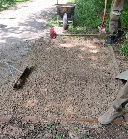 Brouettes, pelles et râteaux en main, l’équipe a ensuite répandu les copeaux sur l’ensemble du chemin, offrant aux promeneurs un revêtement renouvelé, plus agréable et plus sûr sous les pieds.