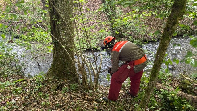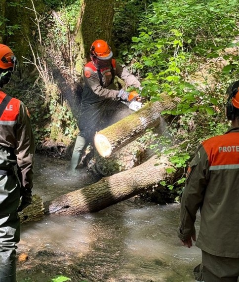Le travail était considérable : de nombreux arbres tombés obstruaient le lit de la rivière sur tout le parcours. Comme lors de l’intervention précédente, les astreints ont œuvré bottes aux pieds, tronçonneuses et tire-fort en action — mais à une tout autre échelle. Chaque tronc dégagé, chaque obstacle retiré, c’est un peu plus de vie rendue à la rivière.
